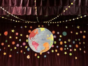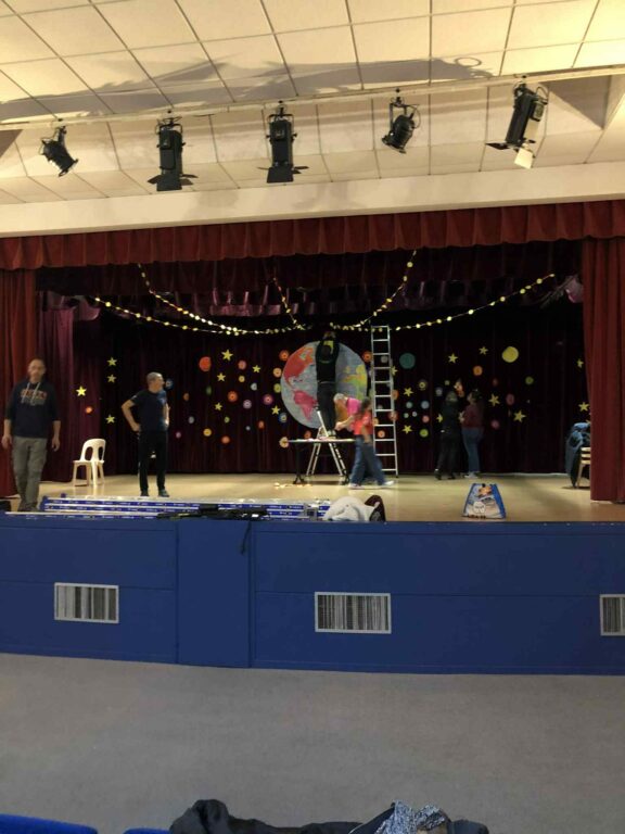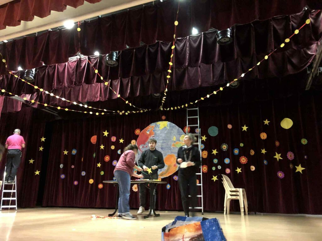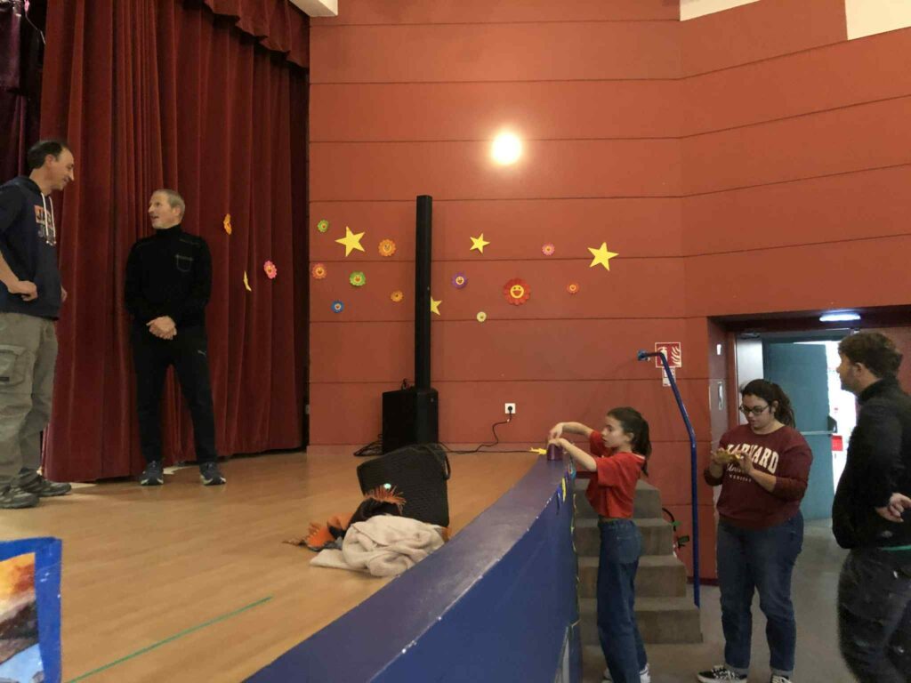 Merci Sébastien , Dominique , merci Marie, Mathéo, merci Emmanuel, merci Lou…Grâce à vous tous , nous avons rapidement monté les décors réalisés par les enfants . Demain ils seront heureux de découvrir une belle scène.