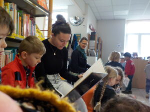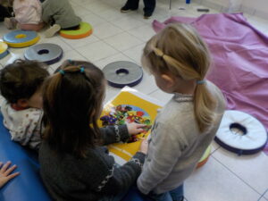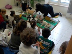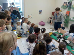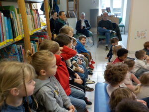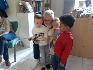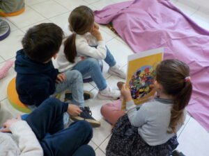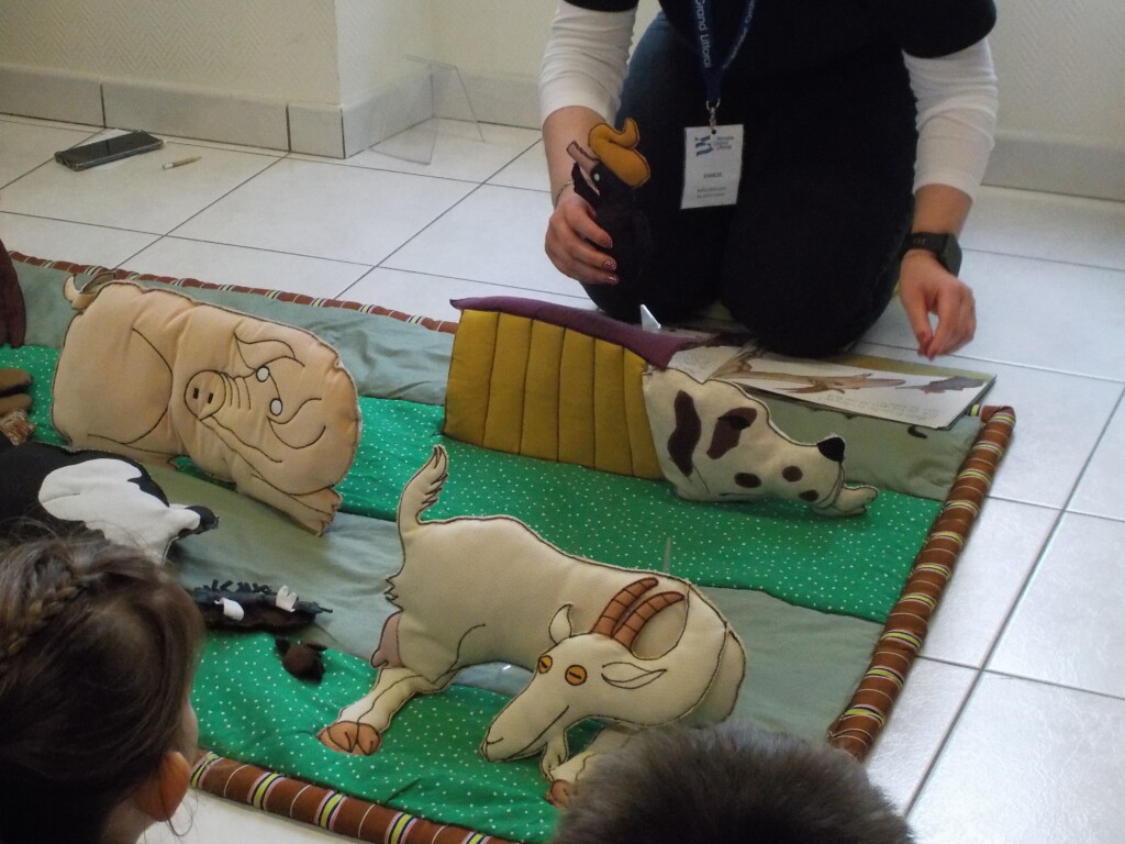Sophie et Emilie nous ont raconté l’histoire De la petite taupe qui voulait savoir qui lui avait fait sur la tête , avec un tapis. Les moyens ont cherché des livres sur les taupes .Nous avons découvert des livres avec les adultes et nous en avons choisis pour la classe.