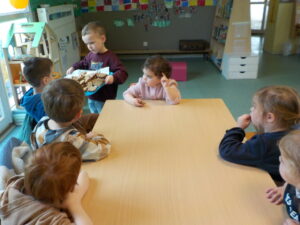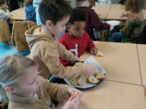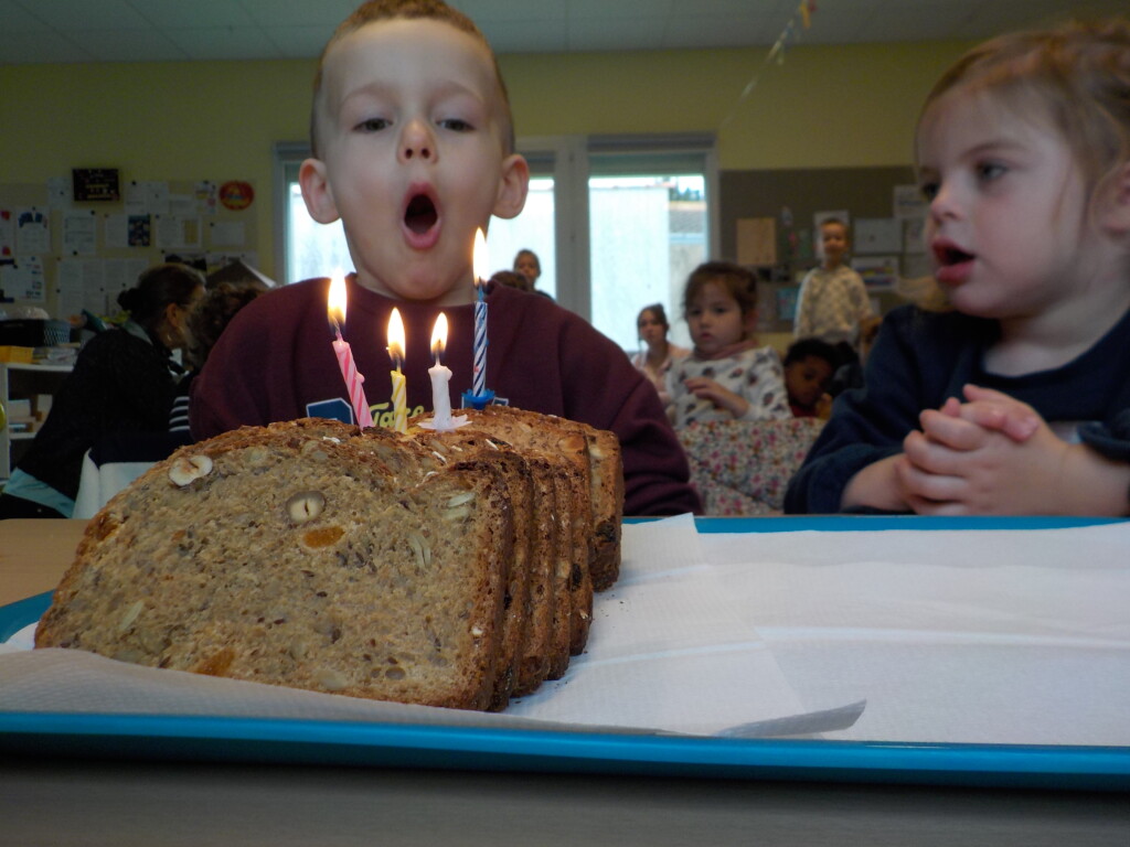 Joyeux anniversaire Sacha,  Joyeux anniversaire Gabriel et  Joyeux anniversaire Gabin . Sacha et Gabriel ont  5 ans et Gabin  a 4 ans . Pour fêter leurs anniversaires , ils nous ont apporté différentes sortes de pains. Ils ont soufflé leurs bougies sur les pains au maïs, aux noisettes, figues et abricots. ..Puis on a partagé et goûté tous les pains qui sentaient très bon , on s’est régalé ! Merci, merci beaucoup à tous.