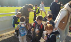 Rendez-vous 10h au stade…C’est parti! Avant les départs, l’ambiance monte chez les supporters. Allez les CE2 , allez les CP……………………………………….On s’échauffe avant le départ. Petits et grands n’ont pas les mêmes contrats, mais tout le monde a fait une belle course, Et mérite d’être médaillé et de se restaurer. Merci…